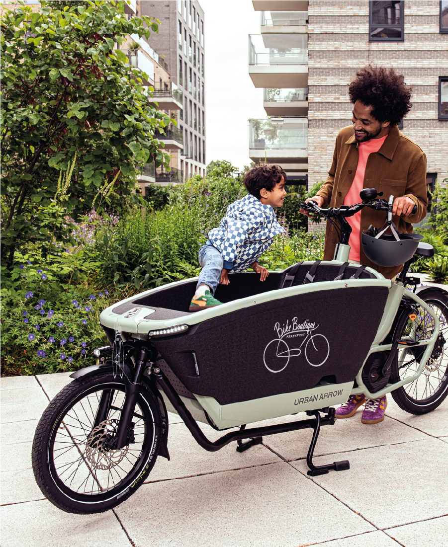 Vor knapp zehn Jahren haben wir uns entschieden, mit welchem Lastenrad wir Frankfurts Straßen wirklich prägen wollen – und wählten das Urban Arrow Family. Seitdem begleiten viele dieser Räder den Alltag unserer Kundinnen und Kunden zuverlässig, einige mit Laufleistungen von über 50.000 km. Sie erleichtern tägliche Wege und tragen dazu bei, den Autoverkehr in der Stadt zu reduzieren. Mit dem Urban Arrow Next wurde das bewährte Konzept weiterentwickelt: Eine komfortablere Box, eine überarbeitete Lenkung und eine serienmäßige Federgabel sorgen für noch mehr Fahrkomfort. Ideal für den Alltag in Frankfurt, etwa für den Kindertransport oder Einkäufe – langlebig, praktisch und durchdacht für Familien.